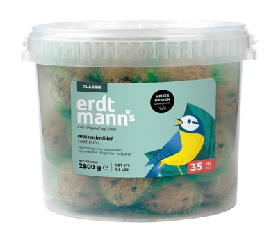 Erdtmann®s Meisenknödel – jetzt auch im biologisch abbaubarem Netz – sind die Klassiker der Wildvogelfütterung. Die vielfältige Zusammensetzung lockt alle Singvögel in Ihren Garten und versorgt sie nicht nur mit den nötigen Energiereserven, sondern ist auch eine gelungene Abwechslung an der Futterstelle. Die optimale Konsistenz und ganze Getreideflocken sichern eine leichte Nahrungsaufnahme. Ein Festmahl besonders für Meisen, Grünfinken, Sperlinge, Baumläufer, Zeisige und Spechte. Einfach in Ästen oder mit praktischen Futterhaltern aufhängen. Im praktischen Aufbewahrungseimer mit 35, 50 oder 100 Stück.