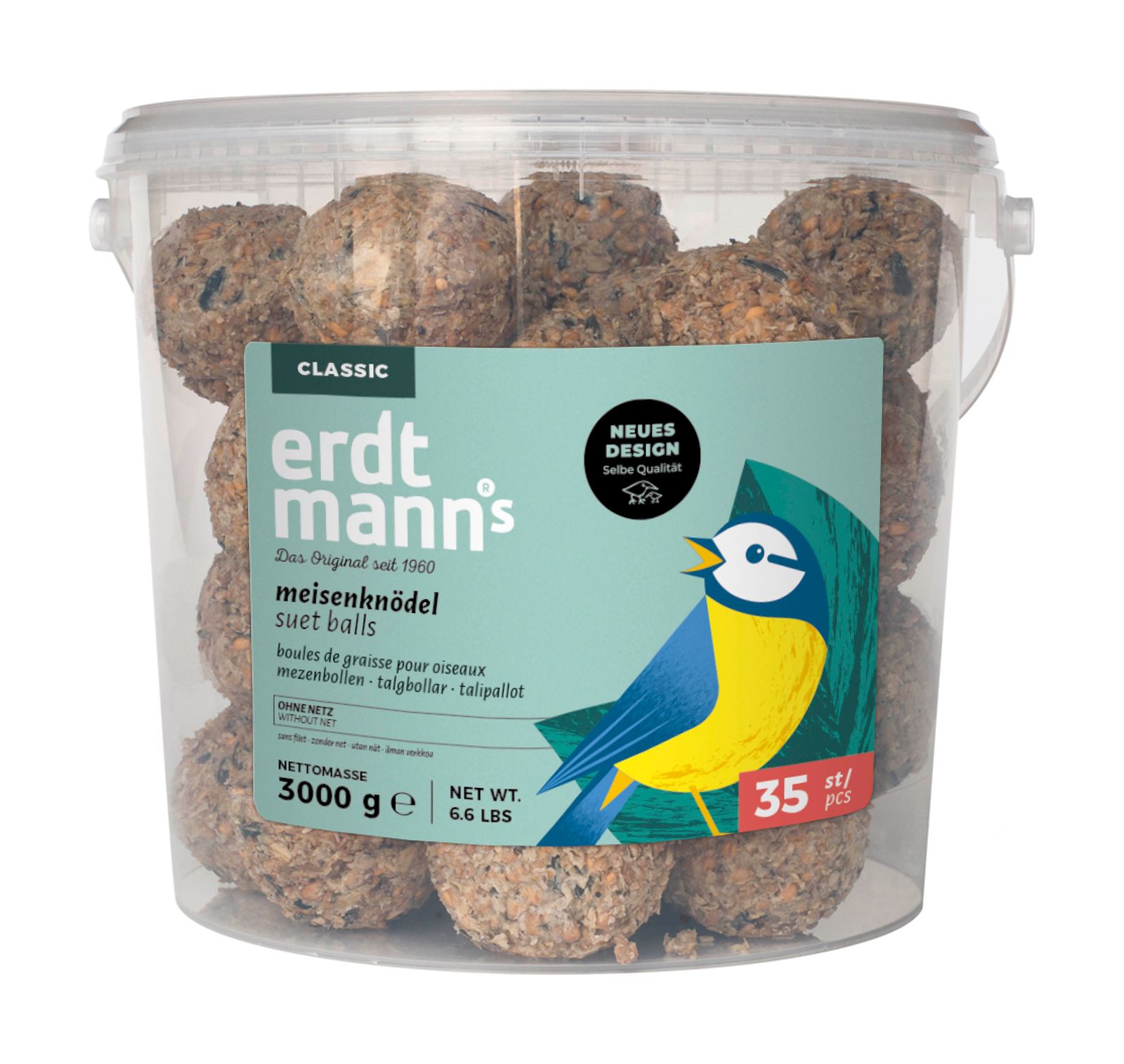 Ein Vergnügen für die Vögel und ein Plus für die Umwelt, weil es keine Netze gibt. Die vielfältige Zusammensetzung von Erdtmanns Meisenknödel lockt alle Singvögel in Ihren Garten und versorgt sie nicht nur mit den nötigen Energiereserven, sondern ist auch eine gelungene Abwechslung an der Futterstelle. Die optimale Konsistenz und ganze Getreideflocken sichern eine leichte Nahrungsaufnahme. Ein Festmahl besonders für Meisen, Grünfinken, Sperlinge, Baumläufer, Zeisige und Spechte. Die Meisenknödel einfach mit praktischen Futterhaltern aufhängen