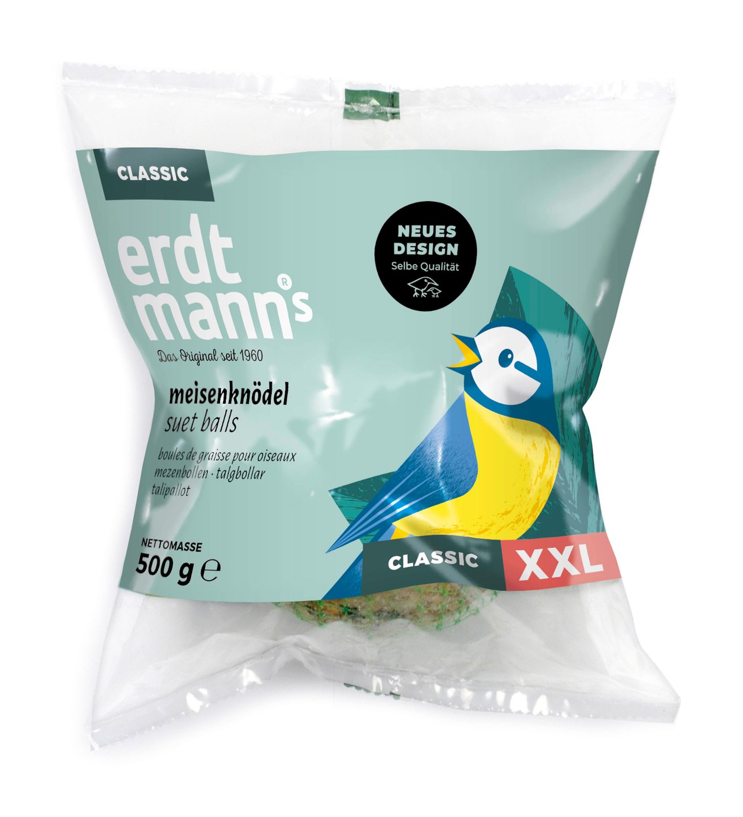 Erdtmann®s Meisenknödel sind die Klassiker der Wildvogelfütterung. Die vielfältige Zusammensetzung lockt alle Singvögel in Ihren Garten und versorgt sie nicht nur mit den nötigen Energiereserven, sondern ist auch eine gelungene Abwechslung an der Futterstelle. Die optimale Konsistenz und ganze Getreideflocken sichern eine leichte Nahrungsaufnahme. Ein Festmahl besonders für Meisen, Grünfinken, Sperlinge, Baumläufer, Zeisige und Spechte. Einfach in die Zweige hängen und fertig ist die Futterstelle. Hier in der XXL-Variante mit 500 g pro Knödel.
