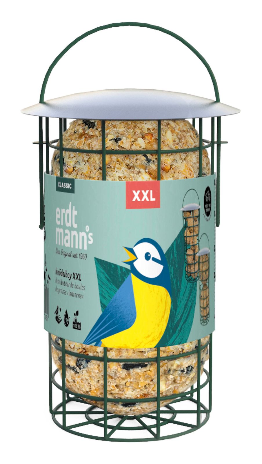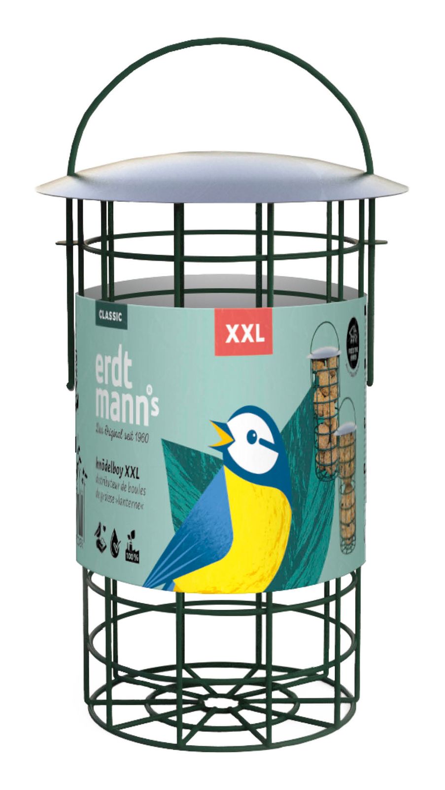 Erdtmann®s Knödelboy eignet sich hervorragend für kleine Balkone, Terrassen und Baumzweige. Diese Futterstelle gibt auch den Meisenknödeln ohne Netz einen sicheren Halt. Einmal aufgefüllt, lockt sie besonders kleinere Vögel wie Meisen, Zeisige und Grünfinken in Ihre Nähe. Dieser Knödelboy XXL ist für Meisenknödel in der Größe XXL (500 g) geeignet. Grün lackiertes Metall, Höhe: 22 cm, für 2 Meisenknödel XXL
