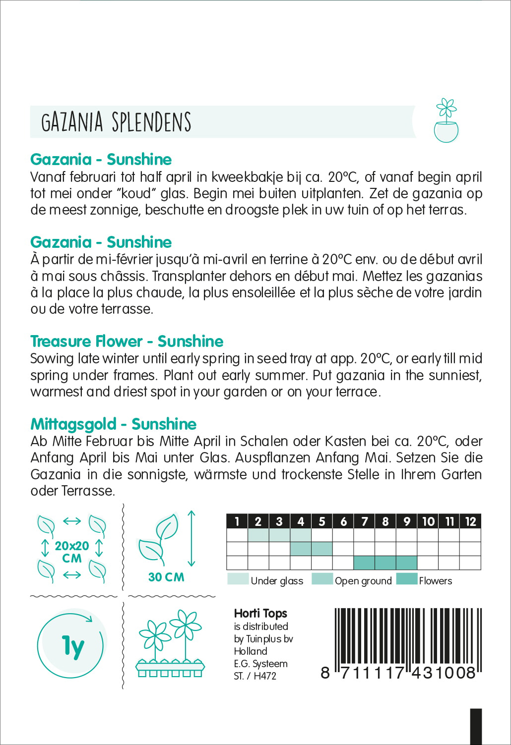 Mittagsgold - Sunshine Ab Mitte Februar bis Mitte April in Schalen oder Kasten bei ca. 20ºC, oder Anfang April bis Mai unter Glas. Auspflanzen Anfang Mai. Setzen Sie die Gazania in die sonnigste, wärmste und trockenste Stelle in Ihrem Garten oder Terrasse.