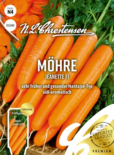 "Jeanette" ist eine frühreifende Möhrenhybride mit langer, glatter und gut durchgefärbter Rübe und kann im relativ jungen Stadium geerntet werden. Die robuste Möhre besitzt einen angenehm süß-aromatischen Geschmack. Das kräftige, aufrechte Laub bleibt lange gesund. Das Abdecken mit einem Kulturschutznetz ist empfehlenswert.
