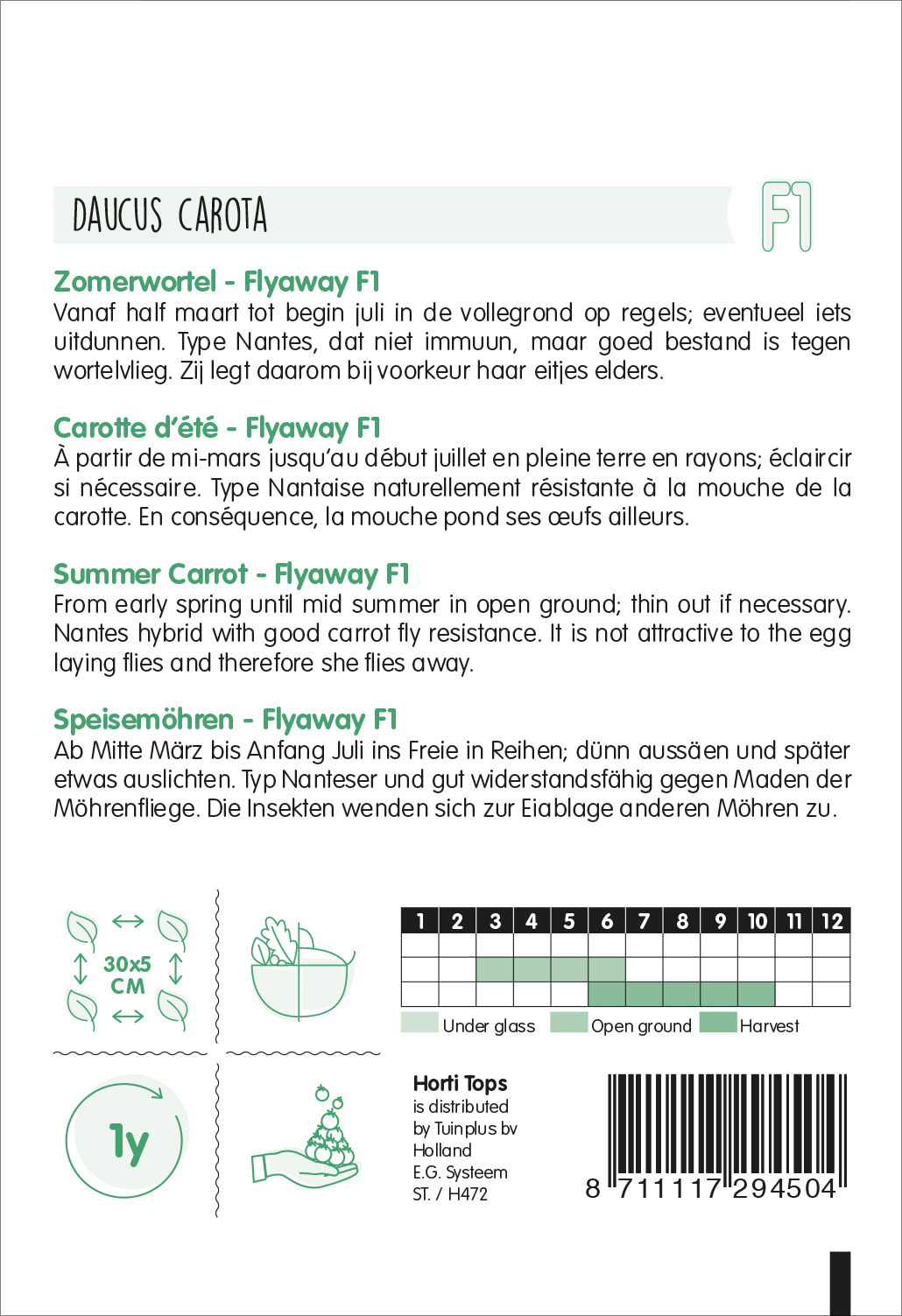 Ab Mitte März bis Anfang Juli ins Freie in Reihen; dünn aussäen und später etwas auslichten. Sehr widerstandsfähig gegen Maden der Möhrenfliege. Die Insekten wenden sich zur Eiablage anderen Möhren zu.