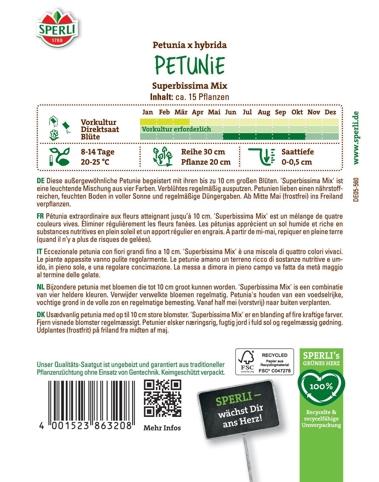 Diese außergewöhnliche Petunie begeistert mit ihren bis zu 16 cm großen Blüten. 'Superbissima Mix' ist eine leuchtende Mischung aus vier Farben. Verblühtes regelmäßig ausputzen. Petunien lieben einen nährstoffreichen, feuchten Boden in voller Sonne und regelmäßige Düngergaben. Ab Mitte Mai (frostfrei) ins Freiland verpflanzen.