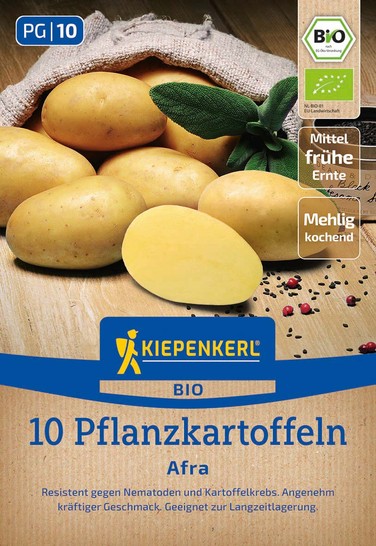 Die mehligkochende Bio-Kartoffelsorte Afra eignet sich ideal für Kartoffelpüree und Klöße. Oval und mittelgroß bis groß, wachsen die Knollen, mit gutem Ertrag. Afra gedeiht am besten in sonnigen Lagen, zeigt hohe Resistenz gegen Krankheiten und ist dank mittelfrüher Reifezeit und guter Keimruhe bis ins Frühjahr lagerfähig.