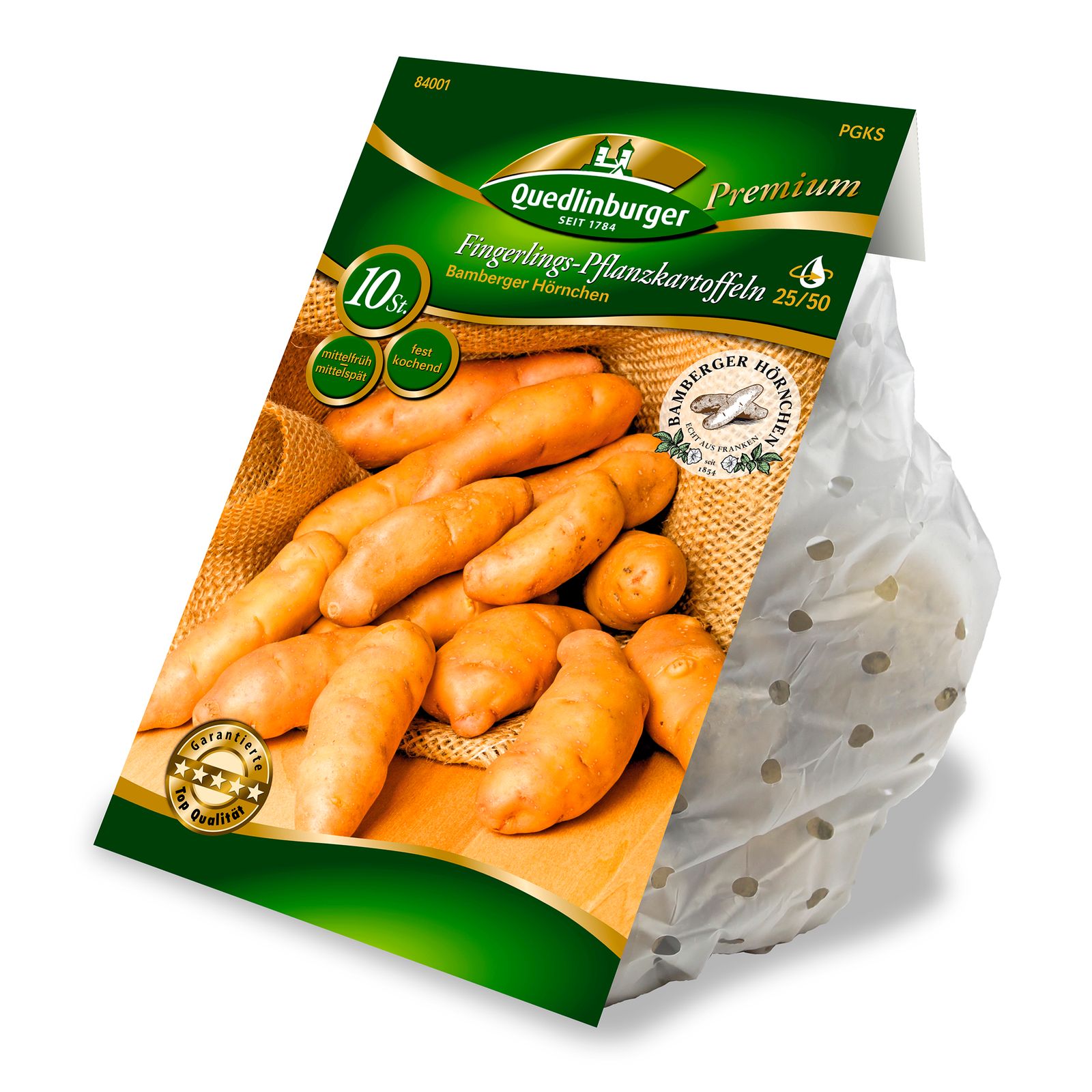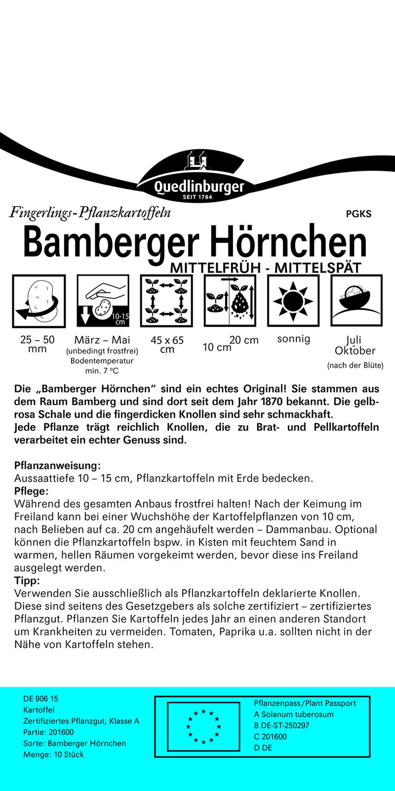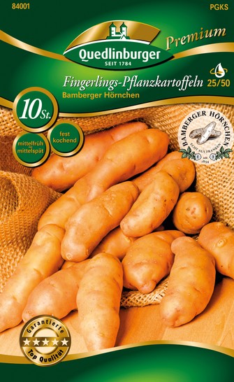 Die "Bamberger Hörnchen" sind ein echtes Original! Sie stammen aus dem Raum Bamberg und sind dort seit dem Jahr 1870 bekannt. Die gelb-rosa Schale und die fingerdicken Knollen sind sehr schmackhaft. Jede Pflanze trägt reichlich Knollen, die zu Brat- und Pellkartoffeln verarbeitet ein echter Genuss sind.