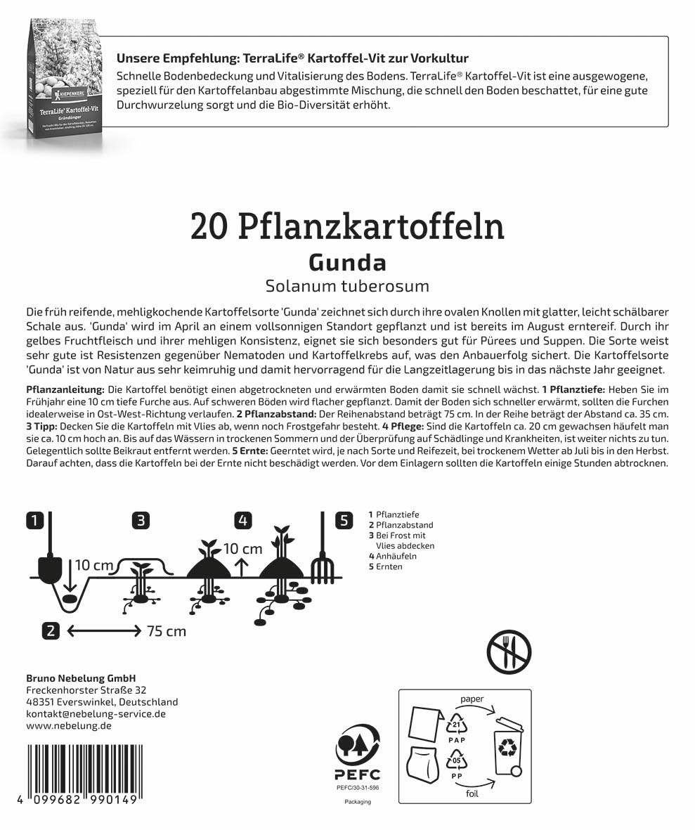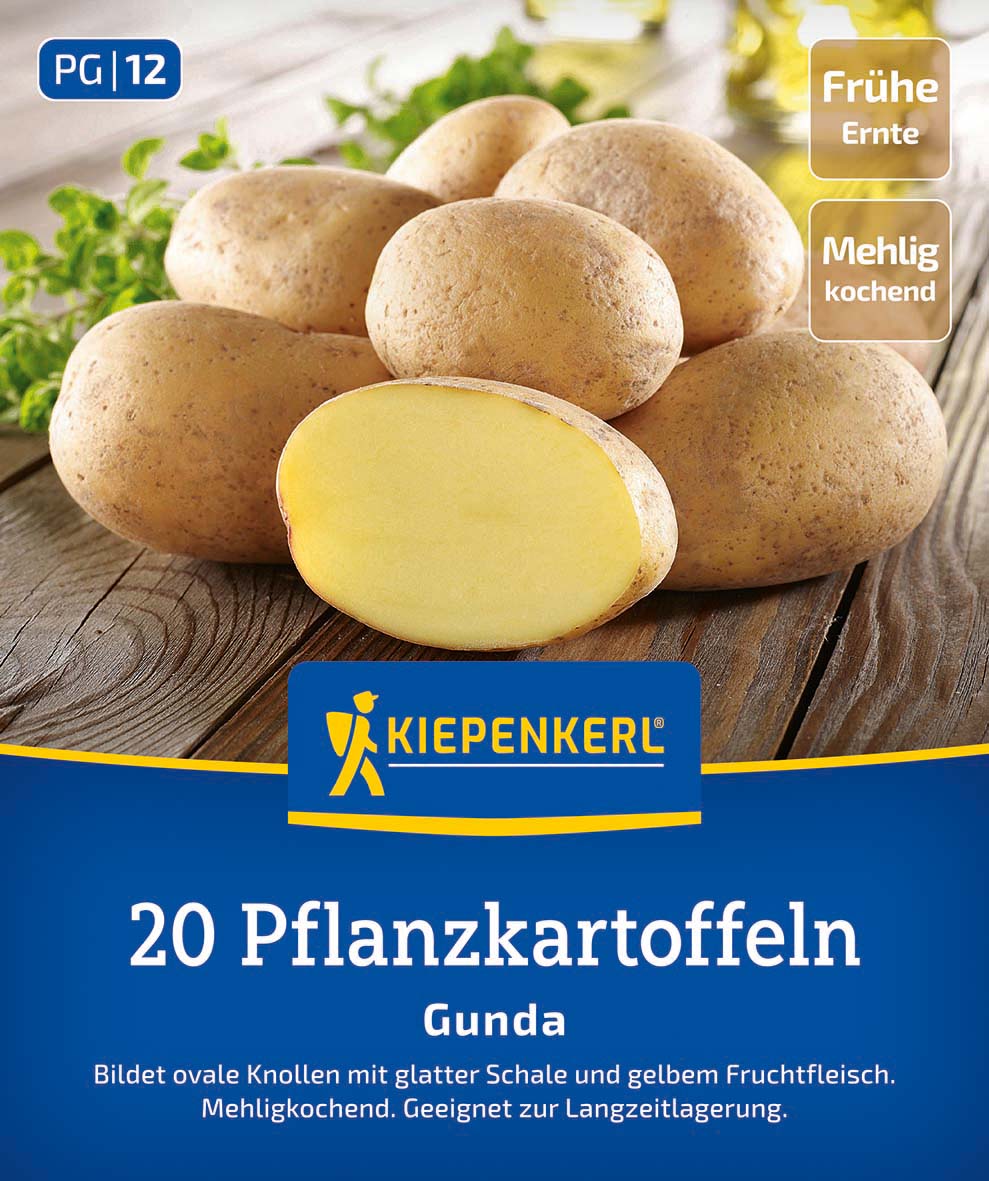 Die frühe Kartoffel 'Gunda' hat eine ovale Form, mit leicht genetzter Schale und gelbem Fruchtfleisch. Die Knollen lassen sich sehr gut schälen. Diese Sorte reift sehr früh heran und ist mehligkochend. 'Gunda' erbringt im August einen hohen Ertrag, der lange gelagert werden kann. Die Pflanzkartoffel bevorzugt mittlere bis bessere Böden mit gleichmäßiger Wasser- und Nährstoffversorgung. Sie ist resistent gegen Nematoden.