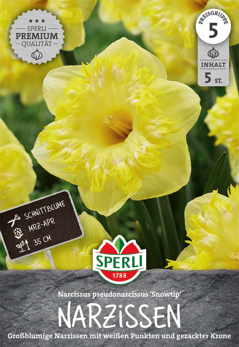 Die großkronige Narzisse 'Snowtip' verdankt ihren Namen durch die schneeweißen Flecken, die an den Rändern und zwischen dem tief gezackten zitronengelben Kelch erscheinen. Dieser dekorativ gerüschte Kelch ragt aus der verblassten gelbgrünen Blütenkrone heraus. Der gesamte Effekt ist atemberaubend und die 'Snowtip' duftet auch noch wunderbar. Die Narzisse 'Snowtip' eignet sich hervorragend in Blumenbeeten, im Kübel und für Steingärten.