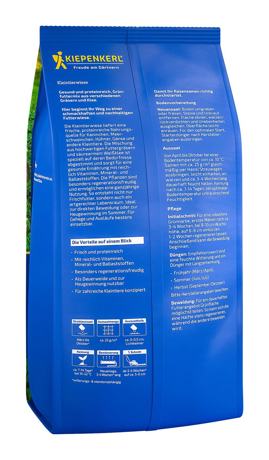 Die Kleintier-Wiese von Kiepenkerl enthält vielfältige landwirtschaftliche Futtergräser und säurearme Weißkleearten. Somit ist diese proteinreiche Mischung genau auf die Bedürfnisse von zahlreichen Haus- und Nutztieren abgestimmt. Die Kiepenkerl Kleintier-Wiese ist eine ganzjährige Futterquelle in freien Ausläufen.