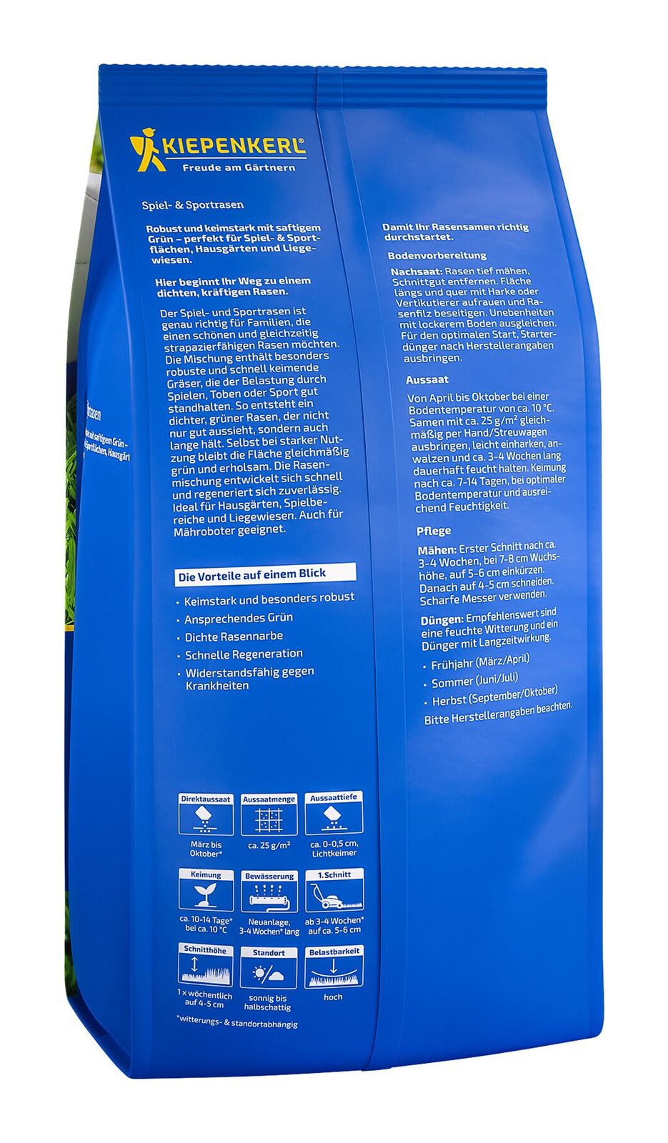 Der Kiepenkerl Spiel- und Sportrasen ist ein klassischer Gebrauchsrasen mit hervorragender Eignung für den Hausgarten. Wächst intensiv grün auf jedem Gartenboden. Robust und sehr strapazierfähig.
