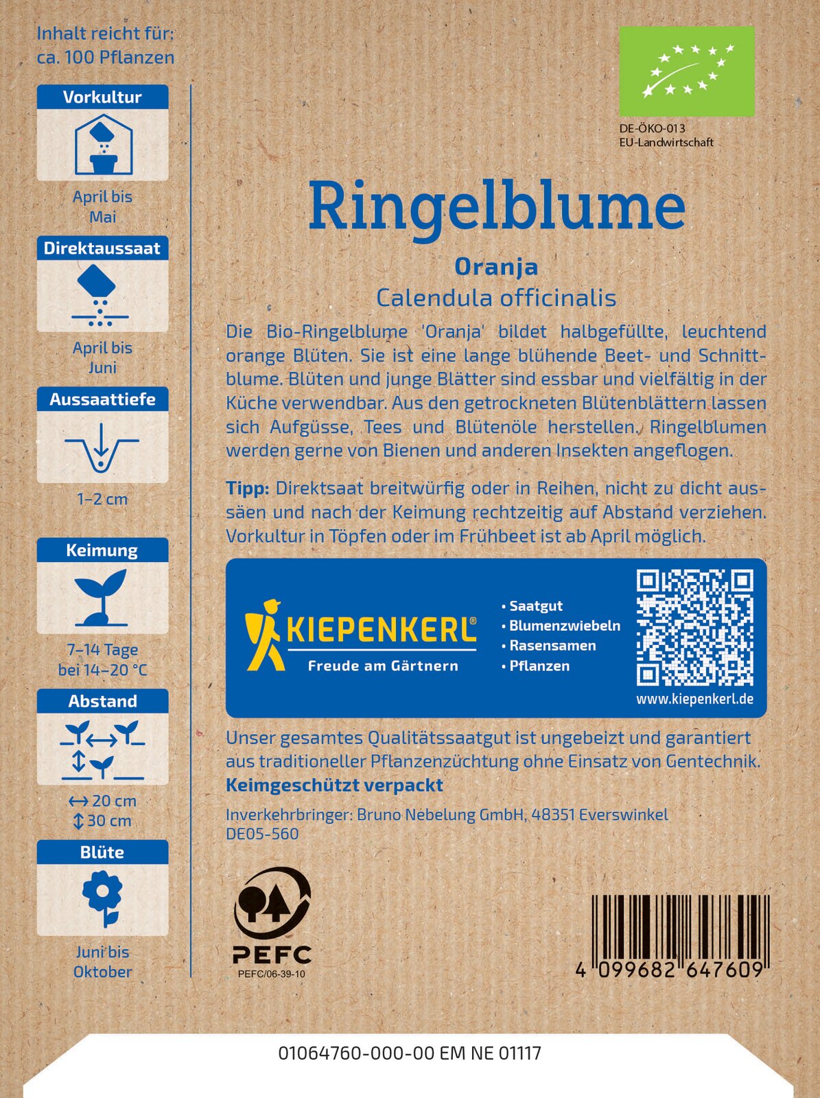 Die BIO-Ringelblume 'Oranja' bildet halbgefüllte, leuchtend orangen Blüten. Sie ist eine lange blühende Beet- und Schnittblume. Blüten und junge Blätter sind essbar und vielfältig in der Küche verwendbar. Aus den getrockneten Blütenblättern lassen sich Aufgüsse, Tees und Blütenöle herstellen. Ringelblumen werden gerne von Bienen und anderen Insekten angeflogen.