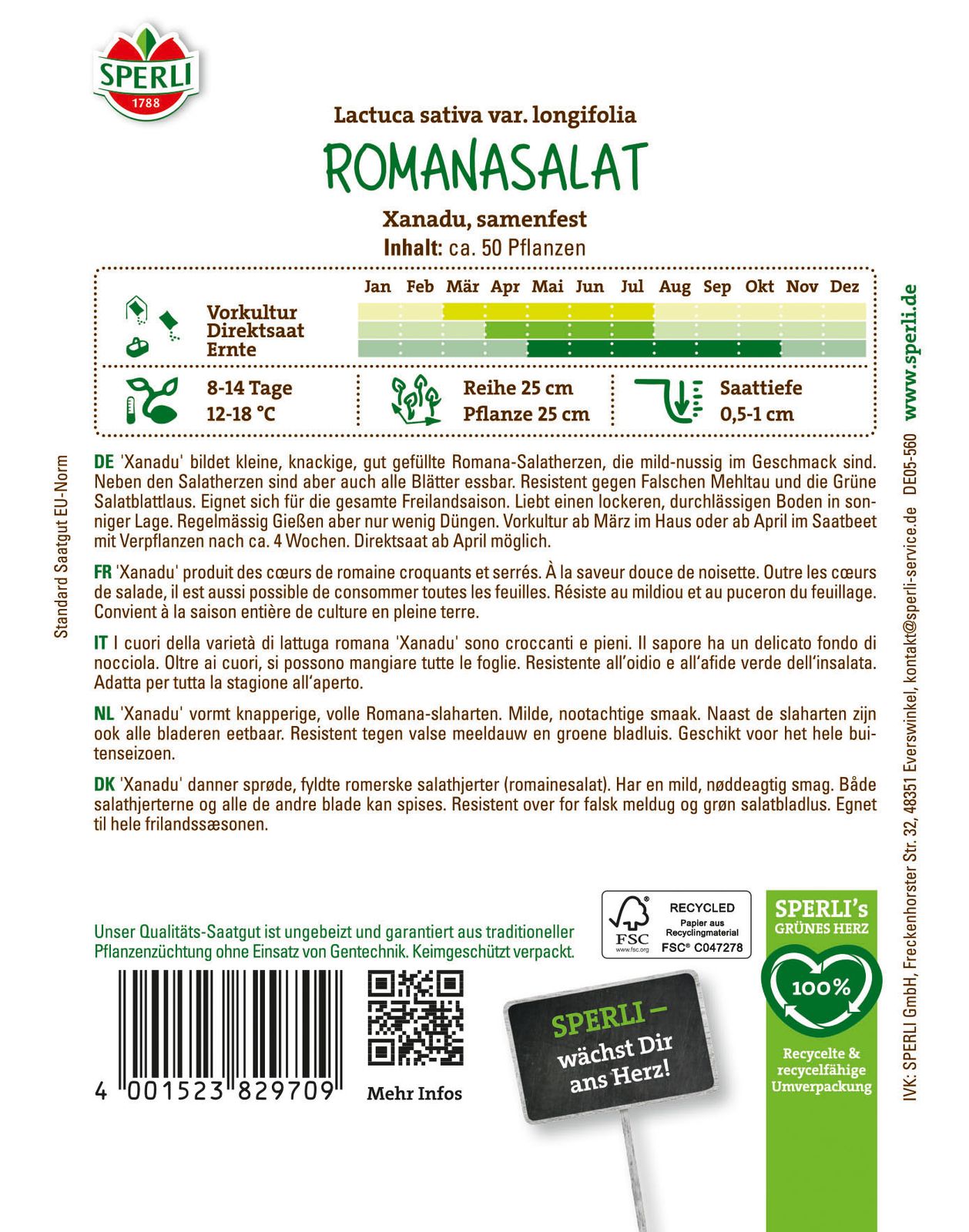 Kompakt und aufrecht wachsender Mini-Romanasalat mit kurzem Strunk. Er bildet kleine, knackige, gut gefüllte Salatherzen, die sich unter den dunkelgrünen Blättern befinden. Sie sind mild-nussig im Geschmack. Die Pflanzen sind resistent gegen Falschen Mehltau und Grüne Salatblattlaus und für die gesamte Freilandsaison geeignet. Die Köpfe sind bei kühler Lagerung nach der Ernte gut haltbar. Romanasalat liebt einen feuchten, nährstoffreichen Boden in voller Sonne. Auf regelmäßige Wassergaben achten. Salat ist ein Schwachzehrer und benötigt keine zusätzlichen Düngergaben. Ab März können die Pflanzen im Haus, Früh- oder Saatbeet vorgezogen und nach ca. 4 Wochen ausgepflanzt werden. Sie können enger als Kopfsalat gepflanzt werden. Ab April ist eine Direktsaat ins Freiland möglich. Temperaturen über 15 °C wirken sich negativ auf die Keimung aus. Wegen Fäulnisgefahr möglichst unterhalb der Blätter gießen.