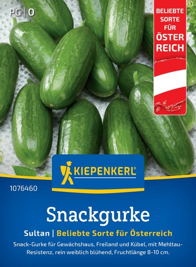 Snack-Gurke für Gewächshaus, Freiland und Kübel, mit Mehltau-Resistenz, rein weiblich blühend, Fruchtlänge 8-10 cm.
