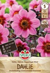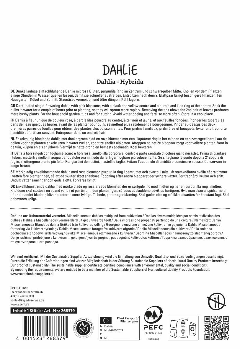 Dunkellaubige einfachblühende Dahlie mit rosa Blüten, purpurlila Ring im Zentrum und schwarzgelber Mitte. Knollen vor dem Pflanzen einige Stunden in Wasser quellen lassen, damit sie schneller austreiben. Entspitzen nach dem 2. Blattpaar bringt buschigere Pflanzen. Für Hausgarten, Kübel und Schnitt. Staunässe vermeiden und öfter düngen. Kühl lagern.