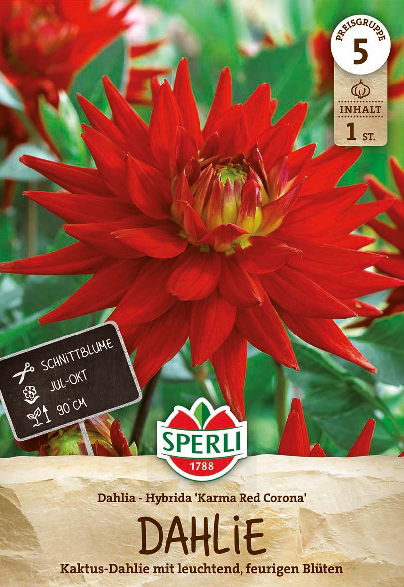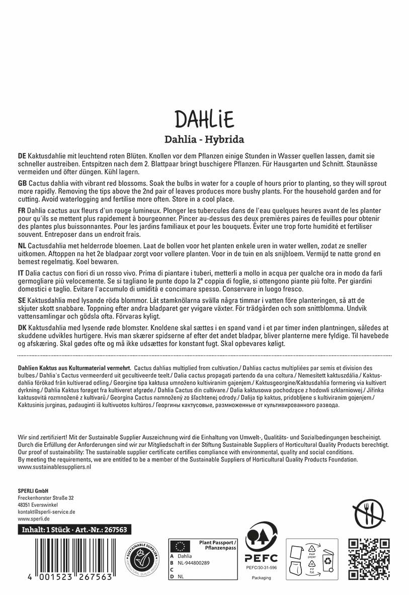 Kaktusdahlie mit leuchtend roten Blüten. Knollen vor dem Pflanzen einige Stunden in Wasser quellen lassen, damit sie schneller austreiben. Entspitzen nach dem 2. Blattpaar bringt buschigere Pflanzen. Für Hausgarten und Schnitt. Staunässe vermeiden und öfter düngen. Kühl lagern.