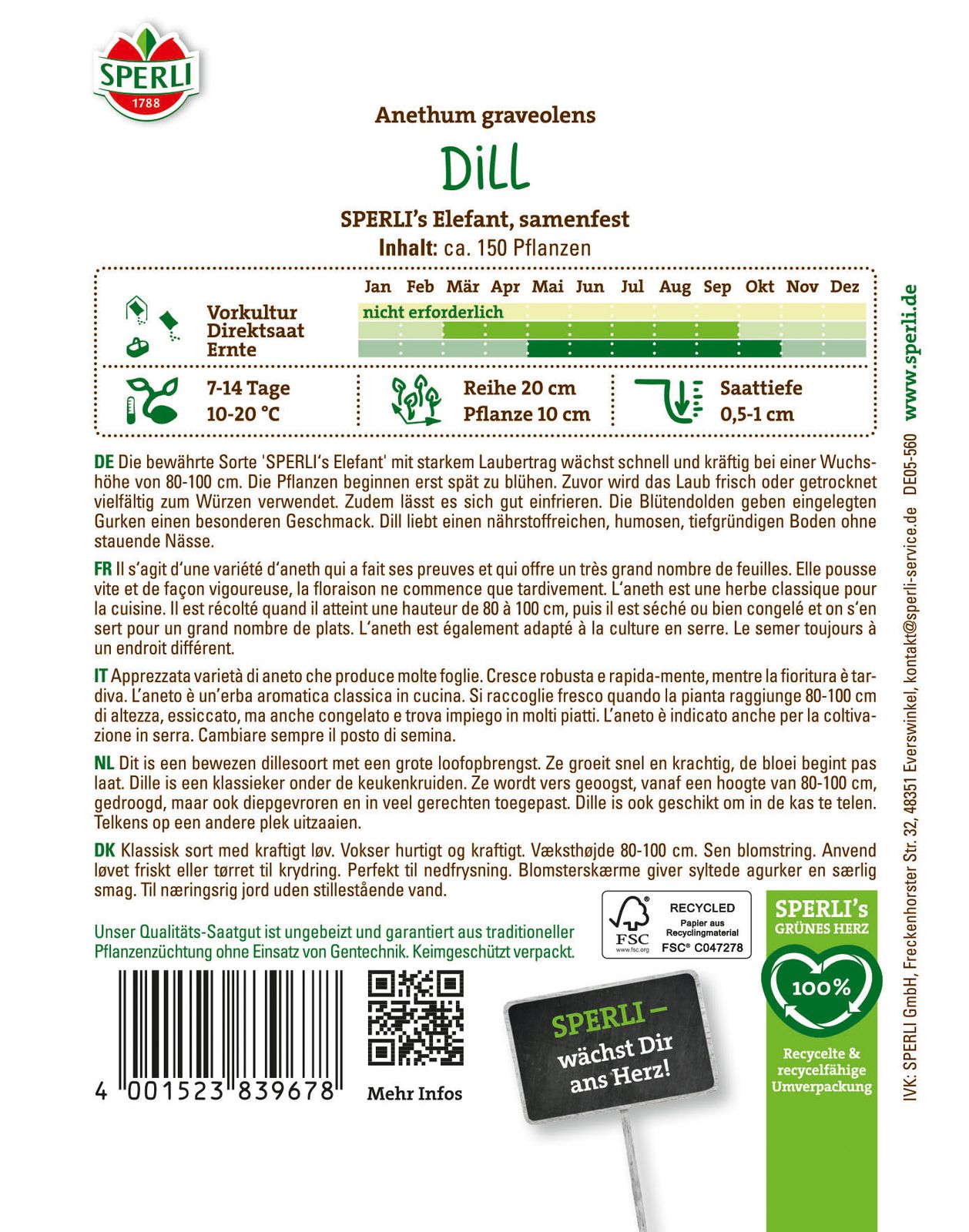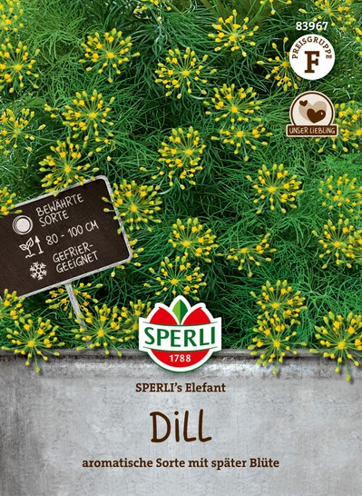 SPERLINGs Elefant ist eine blattreiche Sorte mit hohem Krautertrag und Aromagehalt. Insbesondere für die Freilandaussaat geeignet und ideal für eine lange Ernte, da die Blüte erst spät beginnt. In der Küche wird Dill frisch, getrocknet oder tiefgefroren zum Würzen von Essig, Salaten, Soßen und Fisch verwendet. Unentbehrlich auch zum Einlegen von Gurken, dafür wird die Blütenkrone verwendet. Die Blätter können geerntet werden sobald der Dill 20 - 30 cm hoch ist. In der Naturheilkunde wird der Dill z. B. zur Linderung von Verdauungsbeschwerden oder Blähungen verwendet. Dill ist auch für die Gewächshauskultur geeignet.