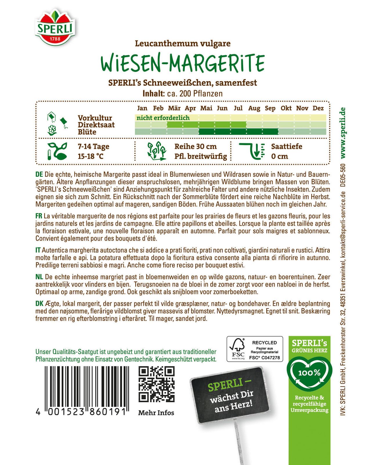 SPERLI's Schneeweißchen ist eine ideale Pflanze für Blumenwiesen, Wildrasen oder Natur- und Bauerngärten. Eine Staude mit grundständigen, länglich gekerbten Blättern sowie einzeln stehenden, 5 cm großen Blütenköpfen.