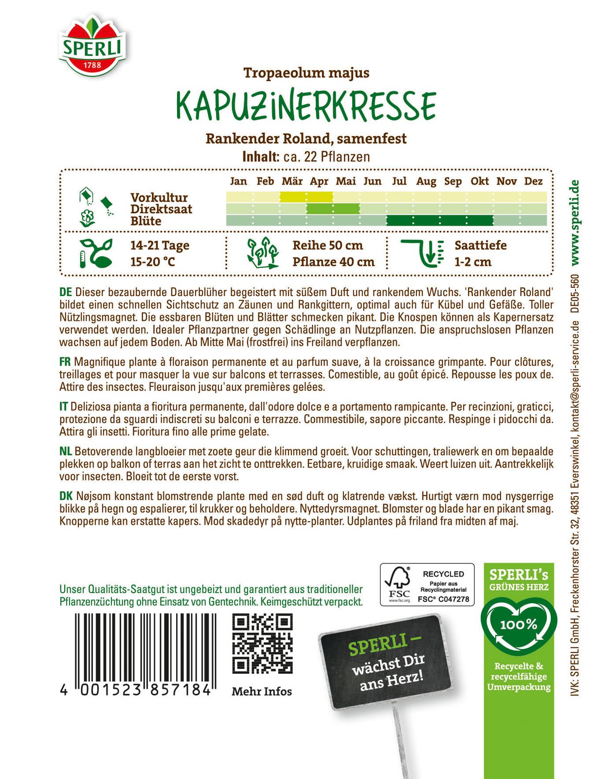 Die Roland Mischung enthält einjährige, einfach gefüllt blühende und rankende Pflanzen in verschiedenen Farben. Kapuzinerkresse ist eine einfach zu ziehende und dauerblühende Gruppenpflanze für Beete, Rabatten, Schalen oder Töpfe. Mit bis zu 3 m rankenden Blattstielen klettert diese Sorte an Zäunen, Bögen und Bäumen empor. Auch an Mauern, neben Treppen oder auf Baumscheiben kommt diese Pflanze gut zur Geltung. Die Blüten, die Blütenknospen und die Blätter sind essbar. Aus den Blütenknospen können Kapern hergestellt werden und die würzig, pfeffrig schmeckenden Blätter und Blüten können im Salat, Kräuterbutter oder Quark verarbeitet werden.
