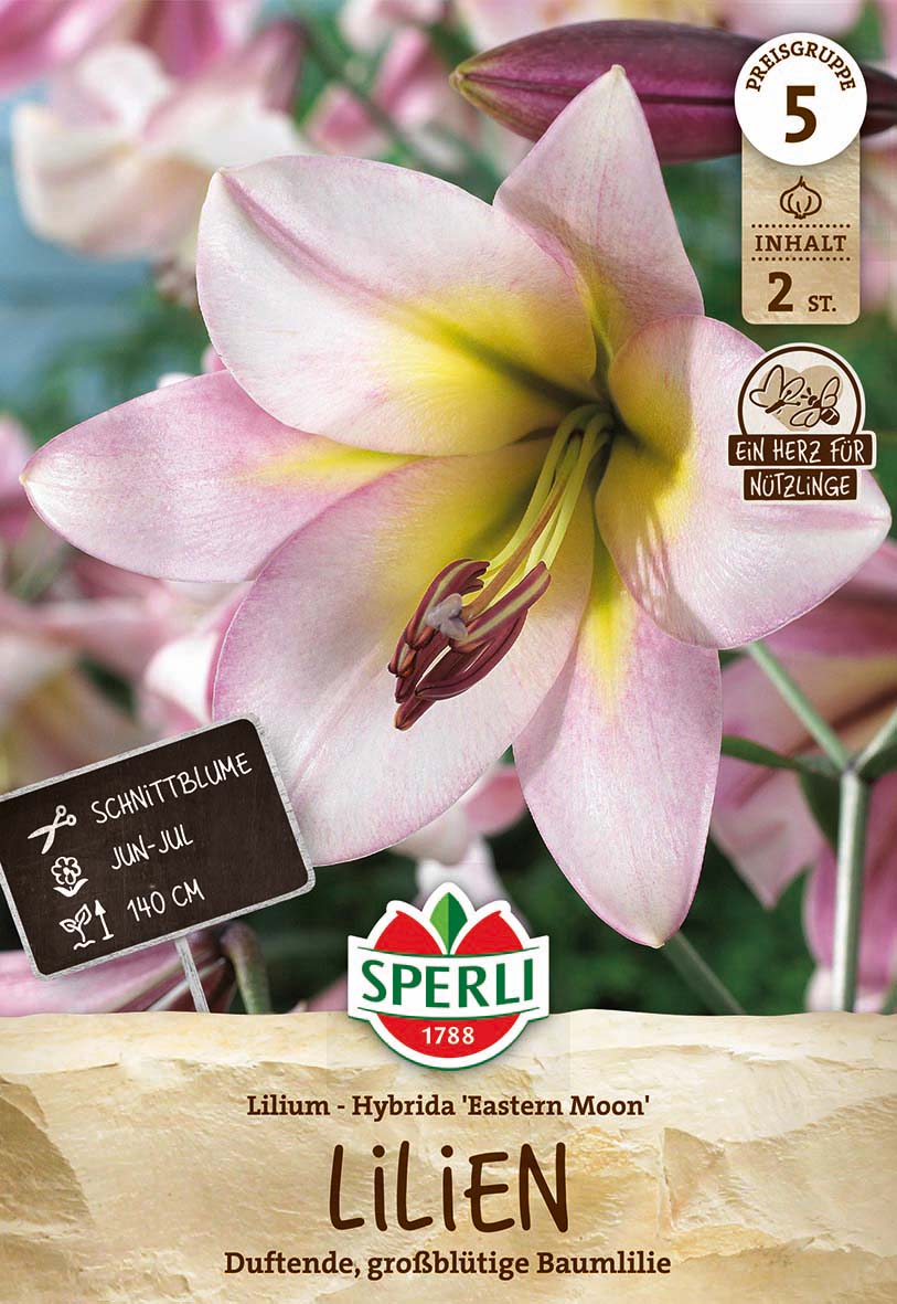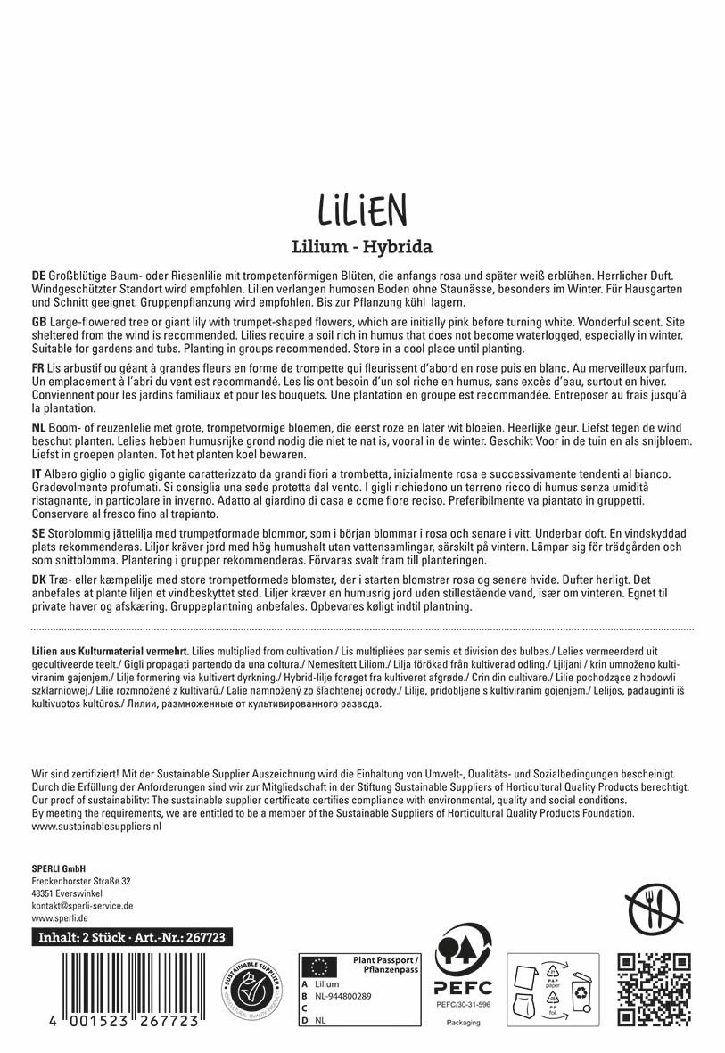 Großblütige Baum - oder Riesenlilie mit trompetenförmigen Blüten, die anfangs rosa und später weiß erblühen. Herrlicher Duft. Windgeschützter Standort wird empfohlen. Lilien verlangen humosen Boden ohne Staunässe, besonders im Winter. Für Hausgarten und Schnitt geeignet. Gruppenpflanzung wird empfohlen. Bis zur Pflanzung kühl lagern.