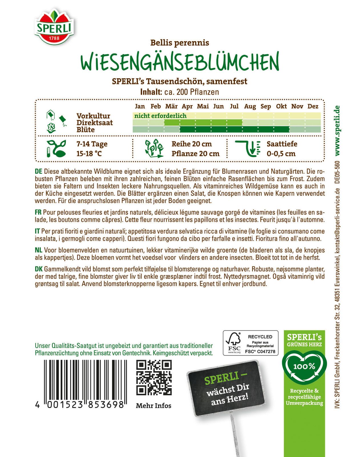 Das echte Wiesengänseblümchen eignet sich nicht nur als Wildgemüse (man verwendet die Blätter ganzjährig als Salat, die Knospen in Essig gelegt wie Kapern), sondern belebt mit seinen einfachen, zahlreich und fast ganzjährig erscheinenden Blüten monotone Rasenflächen.