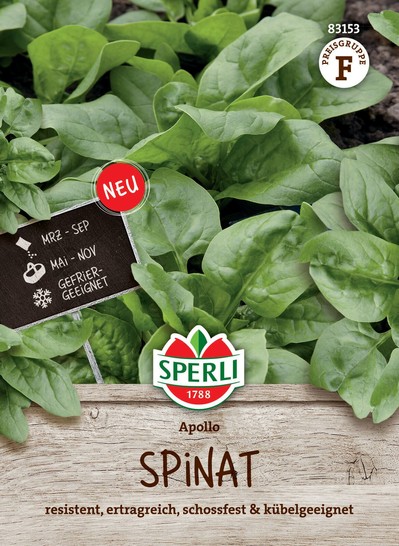 Diese schnellwachsende Sorte mit dicken, dunkelgrünen Blättern ist sehr ertragreich. 'Apollo' ist schossfest und kann das ganze Jahr angebaut werden. Resistent gegen Falschen Mehltau. Spinat ist gefriergeeignet und hat einen hohen Gehalt an Mineralstoffen und Vitaminen. Die Pflanzen benötigen einen gut gedüngten, humosen Boden sowie eine ausreichende Wasserversorgung. Für eine Überwinterung nicht düngen.