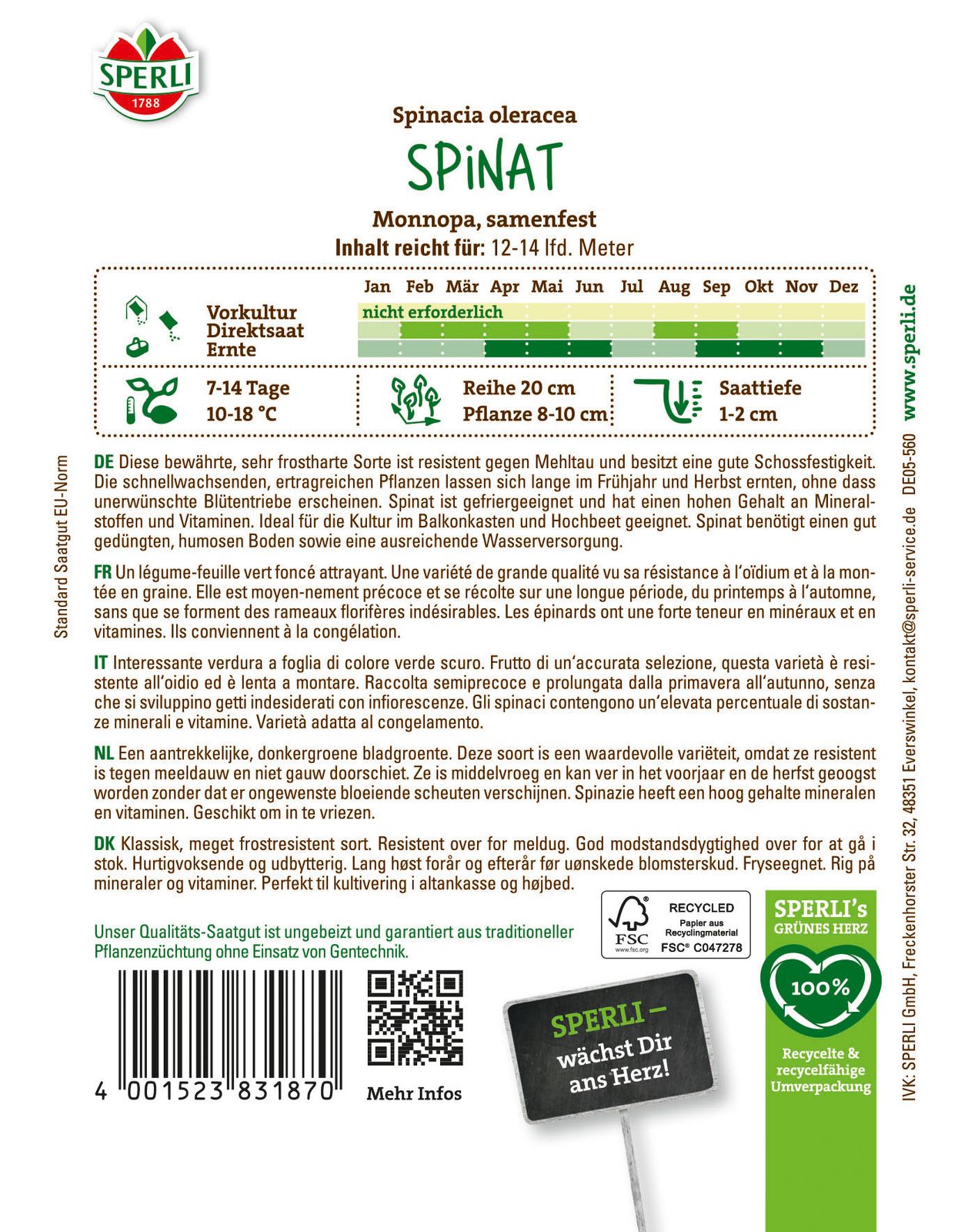 Monnopaist eine rasch wachsende, sehr frostharte, mittelfrühe Sorte mit halb aufrecht stehendem Blatt. Bestens geeignet für den Anbau im Frühjahr und Herbst sowie zur Überwinterung. Beginnt erst sehr spät zu schießen. Spinat ist gedünstet, roh oder als Salat sehr beliebt. Zum Tiefgefrieren geeignet. Monnopaist resistent gegen Mehltau (Pilzerkrankung) und tolerant gegen Mosaikvirus (Viruserkrankung).