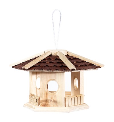 Dieses rustikale Futterhäuschen zum Aufhängen eignet sich hervorragend für Balkone und Terrassen. Einmal angebracht, lockt Ihre Futterstelle alle heimischen Singvögel wie z. B. Meisen, Grünfinken, Kernbeißer und Gimpel in Ihren Garten.