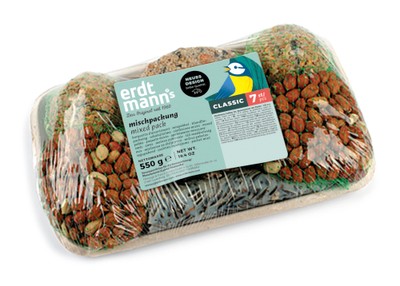 7-teilige Mischpackung: 2 Meisenknödel, 2 Nussbeutel, 2 Meisenringe, 1 Meisenkerze auf Schale