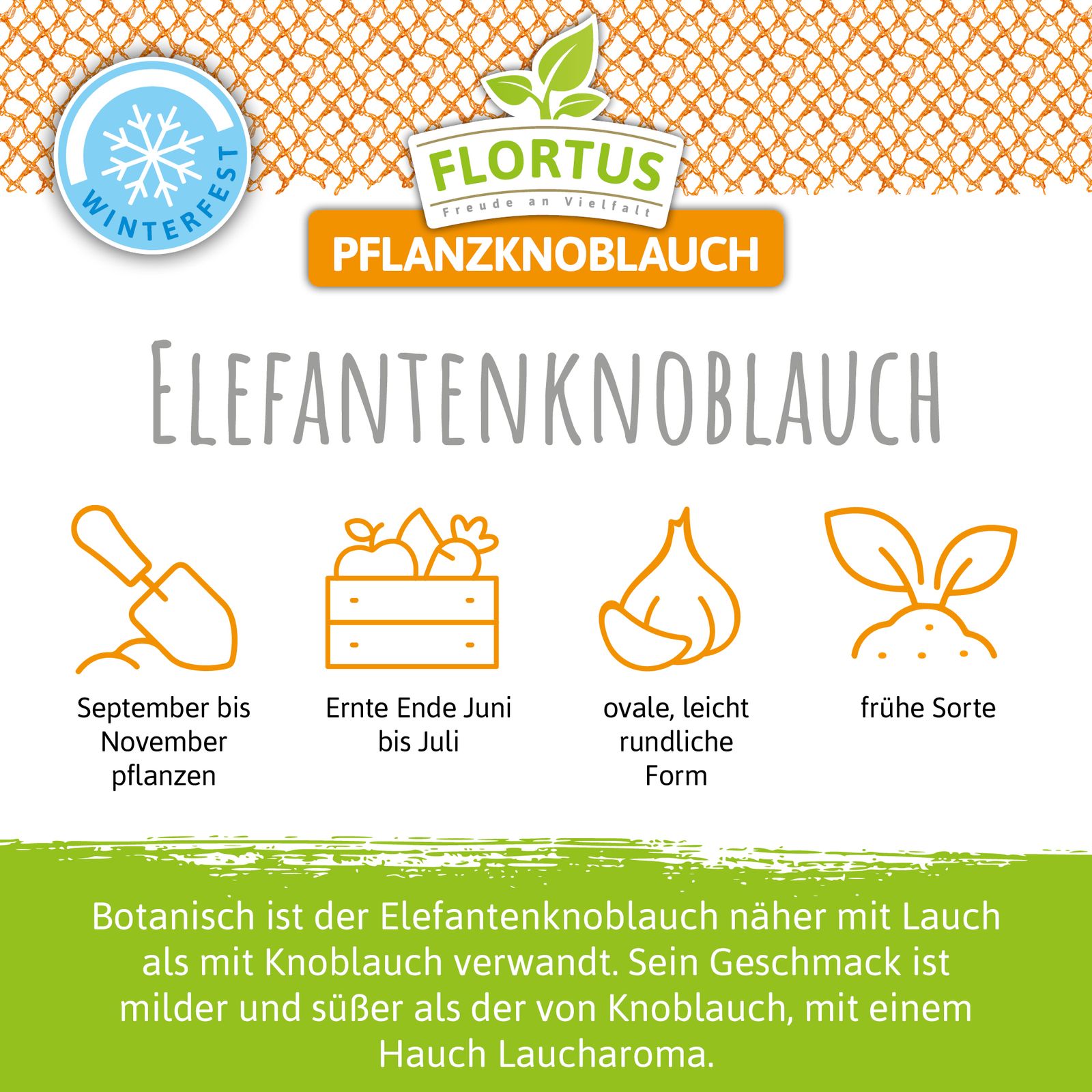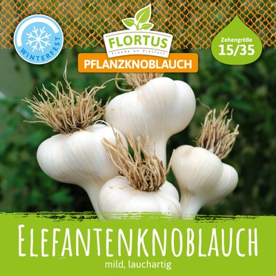 Trotz seines Namens ist der Elefantenknoblauch botanisch gesehen näher mit dem Lauch verwandt als mit echtem Knoblauch. Die Knollen sind besonders groß und haben nur wenige, aber sehr große Zehen. Der Geschmack ist deutlich milder und weniger scharf als bei herkömmlichem Knoblauch, weshalb Elefantenknoblauch auch roh sehr gut verwendbar ist – z. B. in Salaten oder Dips. Beim Kochen oder Braten entwickelt er ein feines, leicht süßliches Aroma. Die Pflanzen sind winterhart und mehrjährig und können sowohl im Herbst als auch im Frühjahr gepflanzt werden.