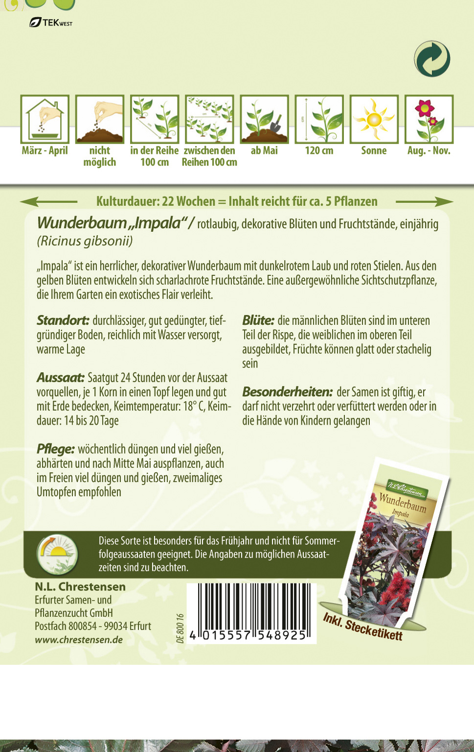 Ricinus communis. Impala ist ein herrlicher, dekorativer Wunderbaum mit dunkelrotem Laub und roten Stielen. Aus den gelben Blüten entwickeln sich scharlachrote Fruchtstände. Eine außergewöhnliche Sichtschutzpflanze, die Ihrem Garten ein exotisches Flair verleiht. Wöchentlich düngen und viel gießen, abhärten und nach Mitte Mai auspflanzen, auch im Freien viel düngen und gießen, zweimaliges Umtopfen empfohlen.