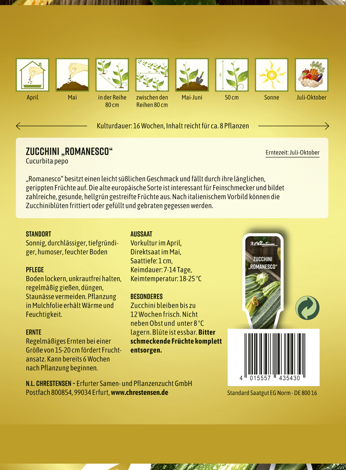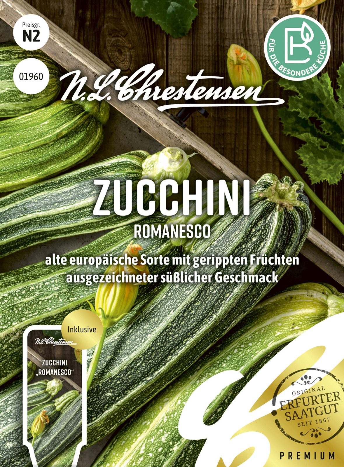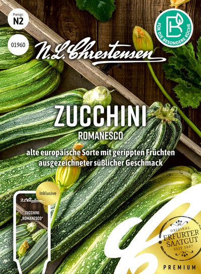 "Romanesco" besitzt einen leicht süßlichen Geschmack und fällt durch ihre länglichen, gerippten Früchte auf. Die alte europäische Sorte ist interessant für Feinschmecker und bildet zahlreiche, gesunde, hellgrün gestreifte Früchte aus. Nach italienischem Vorbild können die Zucchiniblüten frittiert oder gefüllt und gebraten gegessen werden.