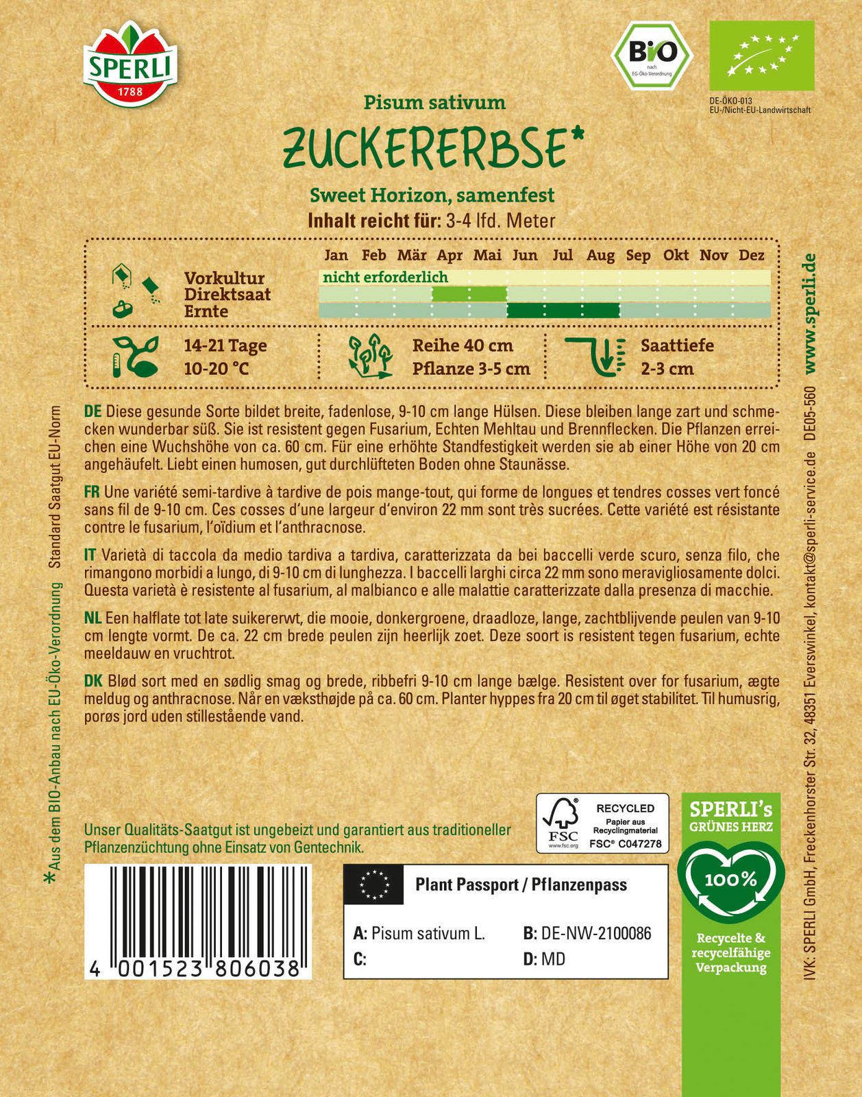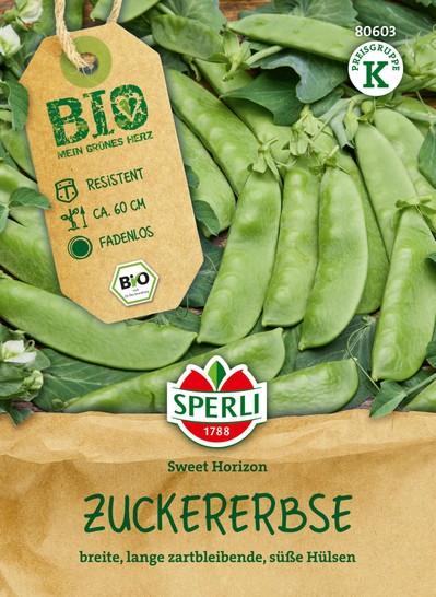 Eine mittelspäte bis späte Zuckererbse, die schöne dunkelgrüne, fadenlose, lange zartbleibende Hülsen bildet. Die ca. 22 mm breiten Hülsen sind wunderbar süß. Diese Sorte ist resistent gegen Fusarium, Echten Mehltau und Brennflecken. Das Anhäufeln der jungen Pflanzen bringt eine gute Standfestigkeit und das Vermeiden von Staunässe garantiert eine lange Pflanzengesundheit. Sie erreicht eine Wuchshöhe von ca. 60 - 80 cm.