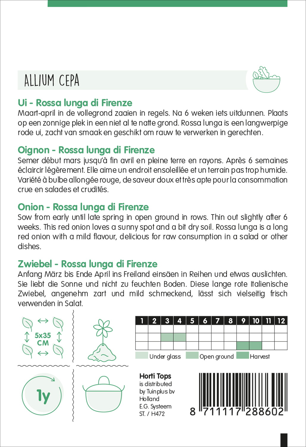 Anfang März bis Ende April ins Freiland einsäen in Reihen und etwas auslichten. Sie liebt die Sonne und nicht zu feuchten Boden. Diese lange rote Italienische Zwiebel, angenehm zart und mild schmeckend, lässt sich vielseitig frisch im Salat verwenden. Hortitops Special Edition